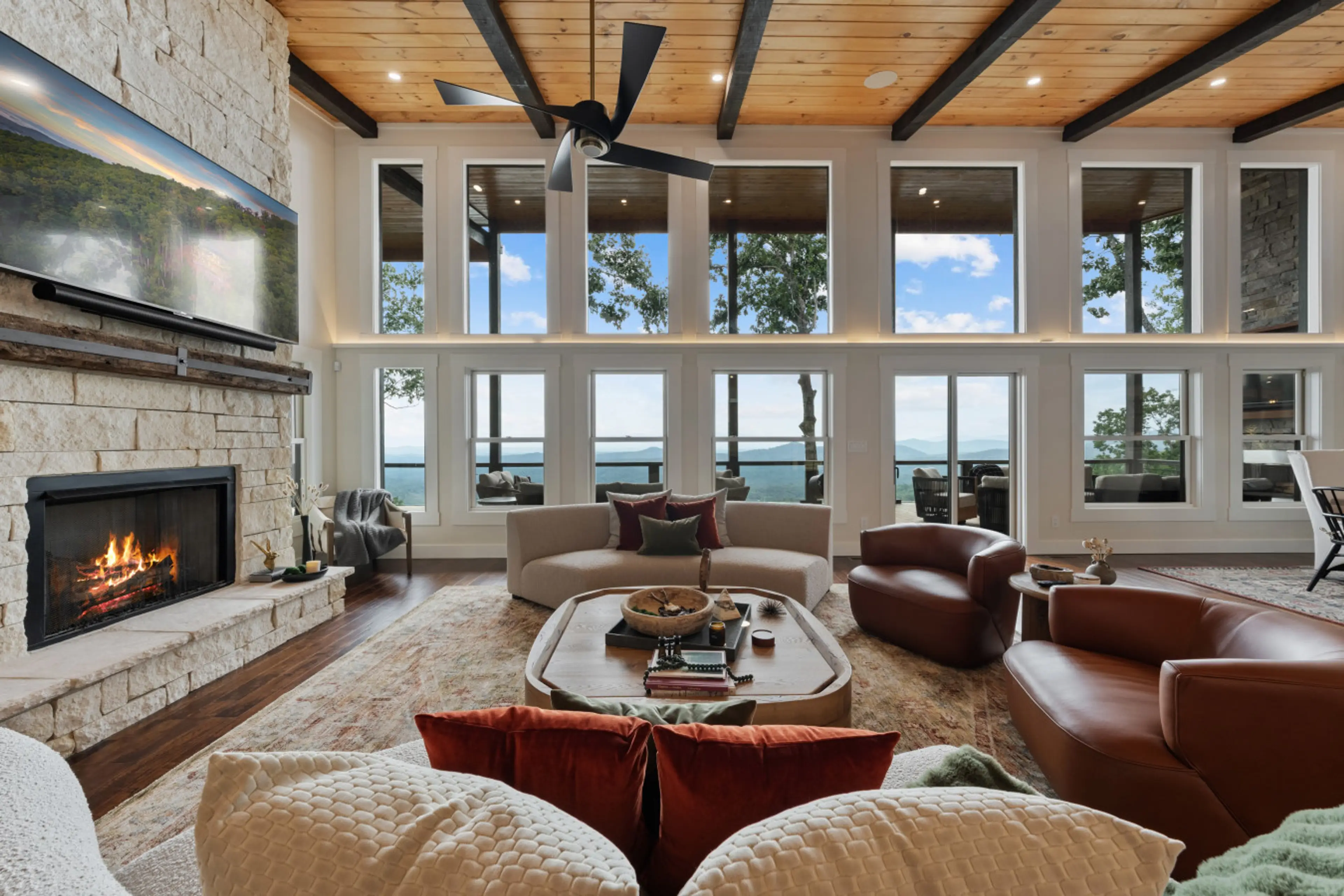 Brand new, modern 5BR / 5BA + bunk room, unobstructed 180 degree mountain views in Blue Ridge from all 3 levels, spa amenities (sauna, cold plunge, hot tub, fitness room with Peloton, dumbells, yoga gear). Perfect sunsets, peaceful, secluded setting, indoor / outdoor bar, 8 fireplaces, firetable, s...
